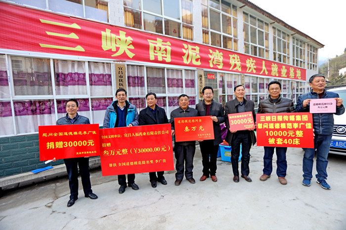 2月6日,宜昌市文明辦率全國文明單位走訪慰問第六屆全國道德模范提名獎獲得者李廣佳。市委宣傳部副部長、市文明辦主任鄒正海受市委常委、市委宣傳部長王國斌委托,為李廣佳及三峽南泥灣殘疾人生活園送去了新春問候和3萬元慰問金。全國文明單位宜昌人福藥業、市國稅局、市地稅局、農行三峽分行和三峽日報傳媒集團的相關負責人也參加走訪慰問,共為生活園贈送幫扶資金13萬元,被套物資40床。
