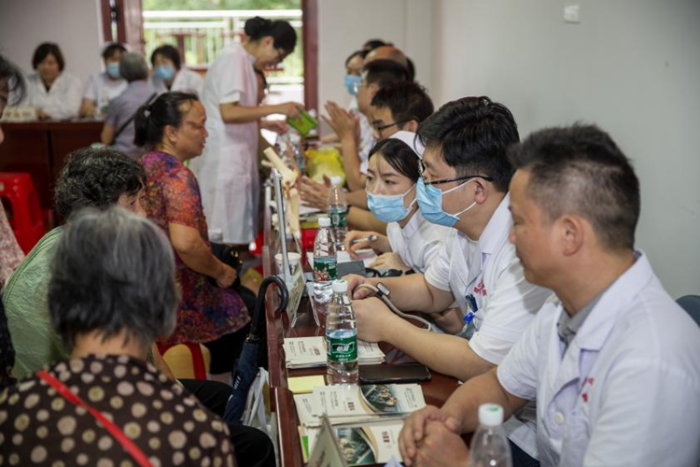 7月22日,湖北省咸寧市咸安區(qū)溫泉街道南昌路社區(qū)組織的義診活動。新華網(wǎng) 鐘奕 攝