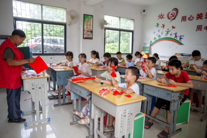 7月23日,咸寧市咸安區(qū)汀泗橋鎮(zhèn)洪口村“四點半學(xué)校”的孩子們在老師的指導(dǎo)下學(xué)習(xí)剪紙。新華網(wǎng) 鐘奕 攝