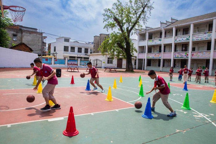 7月23日,咸寧市咸安區(qū)汀泗橋鎮(zhèn)小學(xué)操場上,學(xué)生們進(jìn)行籃球訓(xùn)練。新華網(wǎng) 鐘奕 攝