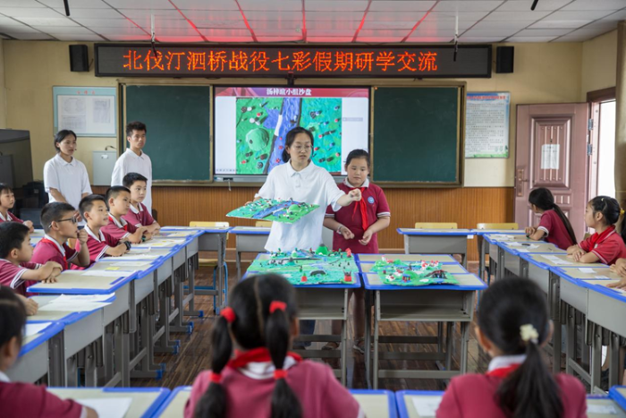 7月23日,咸寧市咸安區(qū)汀泗橋鎮(zhèn)小學(xué)教室里,學(xué)生們在對北伐戰(zhàn)爭汀泗橋戰(zhàn)役進(jìn)行研究學(xué)習(xí)。新華網(wǎng) 鐘奕 攝