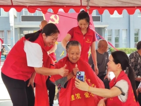 “咔嚓、咔嚓、咔嚓……”在劉口社區新時代文明實踐站,63歲“時間銀行”志愿者程前關嫻熟地“舞動”著手中的剪刀,經過精心修剪,社區老人的頭發變得干凈整齊。