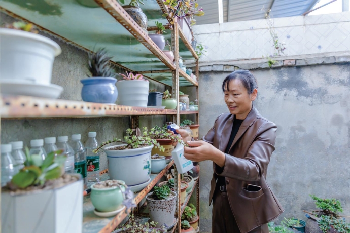 劉戊銀的愛好,她的丈夫陳文兵全力支持,他專門給妻子開辟一方小院,裝上一排花架,尋來舊罐子、舊缸子,還幫著拖土澆水……小院里,藏著四季詩意、家庭和美。