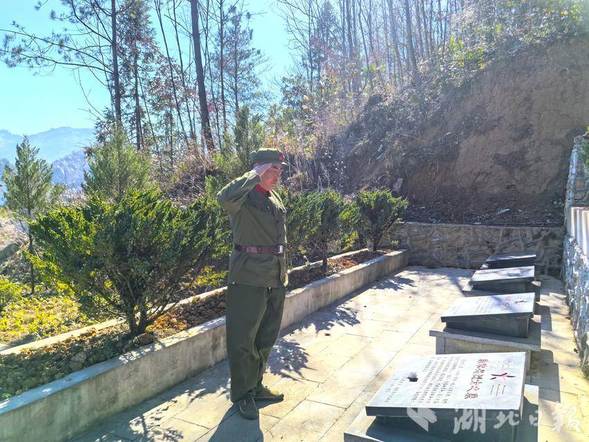 隊伍中,一位特殊的祭掃者引起了大家的注意,退役軍人唐生波來到他的爺爺——烈士唐家興的墓碑前,鄭重跪拜,行軍禮。