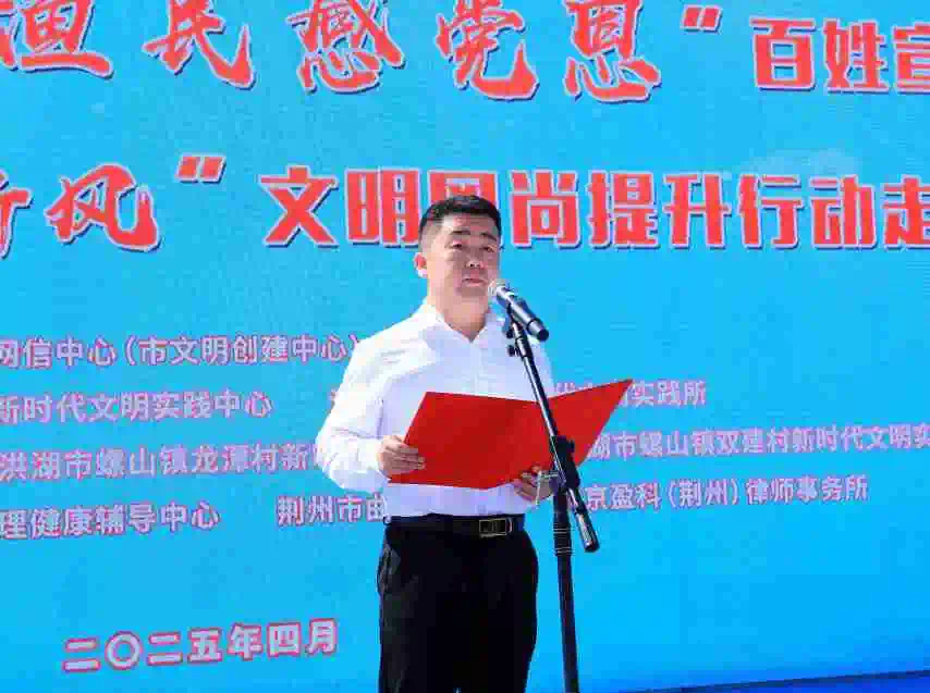 2025年4月15日,洪湖市"洪湖漁民感黨恩"百姓宣講暨"文明洪湖 水鄉(xiāng)新風(fēng)"文明風(fēng)尚提升行動(dòng)活動(dòng)在螺山鎮(zhèn)柏心廣場(chǎng)隆重舉辦。此次活動(dòng)旨在以文化浸潤(rùn)民心、以文明賦能發(fā)展,全面展現(xiàn)新時(shí)代洪湖人民感黨恩、跟黨走的精神風(fēng)貌,奮力書(shū)寫(xiě)水鄉(xiāng)高質(zhì)量發(fā)展的時(shí)代答卷。