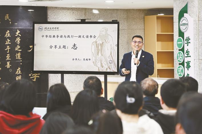 “國(guó)學(xué)經(jīng)典學(xué)習(xí)——湖文讀書(shū)會(huì)”堅(jiān)持“學(xué)經(jīng)用典,修身養(yǎng)性”,引導(dǎo)廣大師生“愛(ài)讀書(shū)、讀好書(shū)、善讀書(shū)”,將教育教學(xué)與經(jīng)典閱讀有機(jī)融合,豐富校園文化,厚植家國(guó)情懷,傳承愛(ài)國(guó)精神。每期讀書(shū)會(huì)由導(dǎo)讀講師圍繞主題進(jìn)行學(xué)習(xí)分享,參會(huì)的師生自由交流,分為“感悟經(jīng)典、踐行經(jīng)典、研討經(jīng)典、誦讀經(jīng)典”四個(gè)環(huán)節(jié)。讀書(shū)會(huì)強(qiáng)調(diào)學(xué)以致用,通過(guò)師生“共學(xué)、共享、共長(zhǎng)”,達(dá)到“引發(fā)思考、引起共鳴、引導(dǎo)踐行”的效果。“國(guó)學(xué)經(jīng)典學(xué)習(xí)——湖文讀書(shū)會(huì)”為師生搭建了一座通往國(guó)學(xué)經(jīng)典的智慧橋梁,已成為學(xué)校黨建引領(lǐng)、文化育人的實(shí)踐典范,為校園注入了濃厚的文化氣息,讓國(guó)學(xué)經(jīng)典在新時(shí)代煥發(fā)出勃勃生機(jī)。