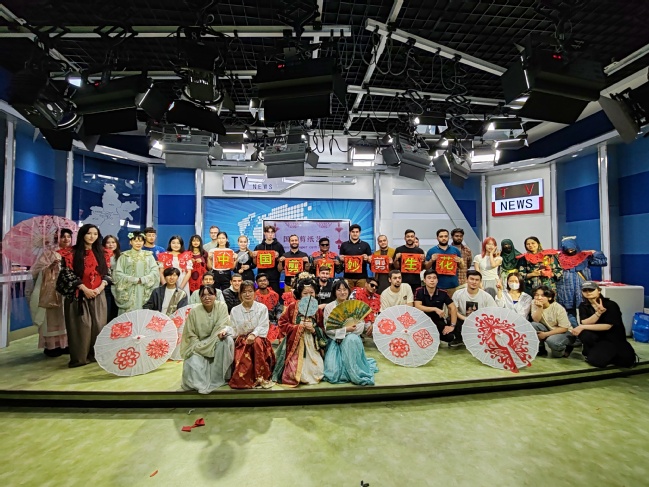 活動現場,留學生們身著云肩刺繡漢服,手持支架拍攝國風大片,刺繡紋樣與剪紙圖騰在光影中交融,傳統與現代元素在歡笑中共舞。