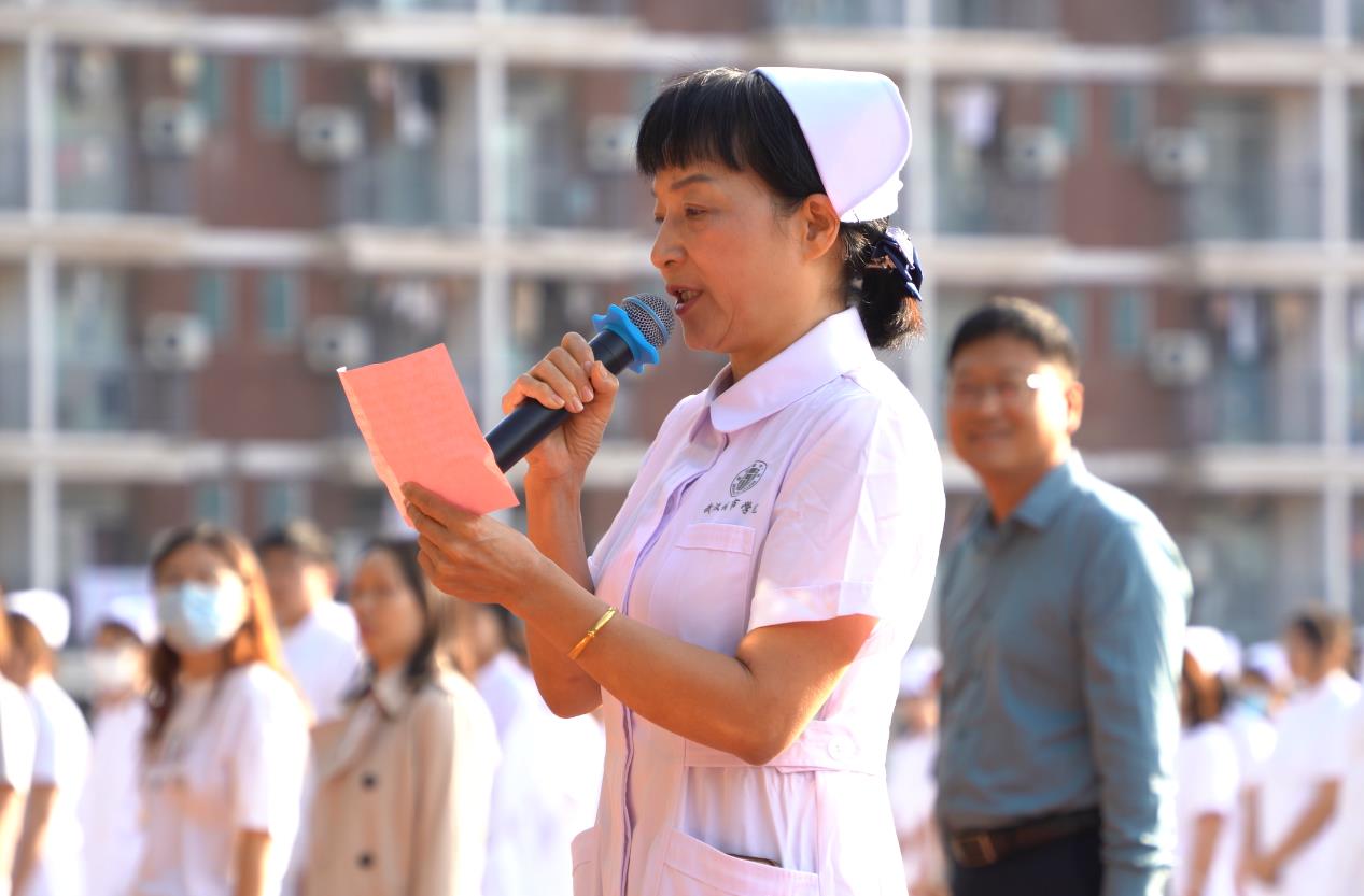 升旗儀式后,在趙光紅副校長的帶領下,參加儀式的全體師生舉起右臂,面對鮮艷的五星紅旗莊嚴宣誓,鄭重承諾:“當我步入神圣護理行列的時刻,謹莊嚴宣誓:我志愿獻身護理事業,奉行人道主義精神,堅守救死扶傷的信念,履行‘保存生命、減輕痛苦、促進健康’的職責;我宣誓:遵守護士的職業道德規范,像南丁格爾那樣,以一顆同情的心和一雙愿意工作的手,以真心、愛心和責任心對待每一位病人;我宣誓:不忘今天的決心和誓言,熱愛專業、勤勉好學,忠于職守,兢兢業業,接過前輩手中的紅燭,燃燒自己,照亮他人,將畢生精力奉獻給護理事業。”誓言鏗鏘有力,一字一句都代表著他們對護理事業的無限熱愛與執著追求,決心踐行南丁格爾精神。
