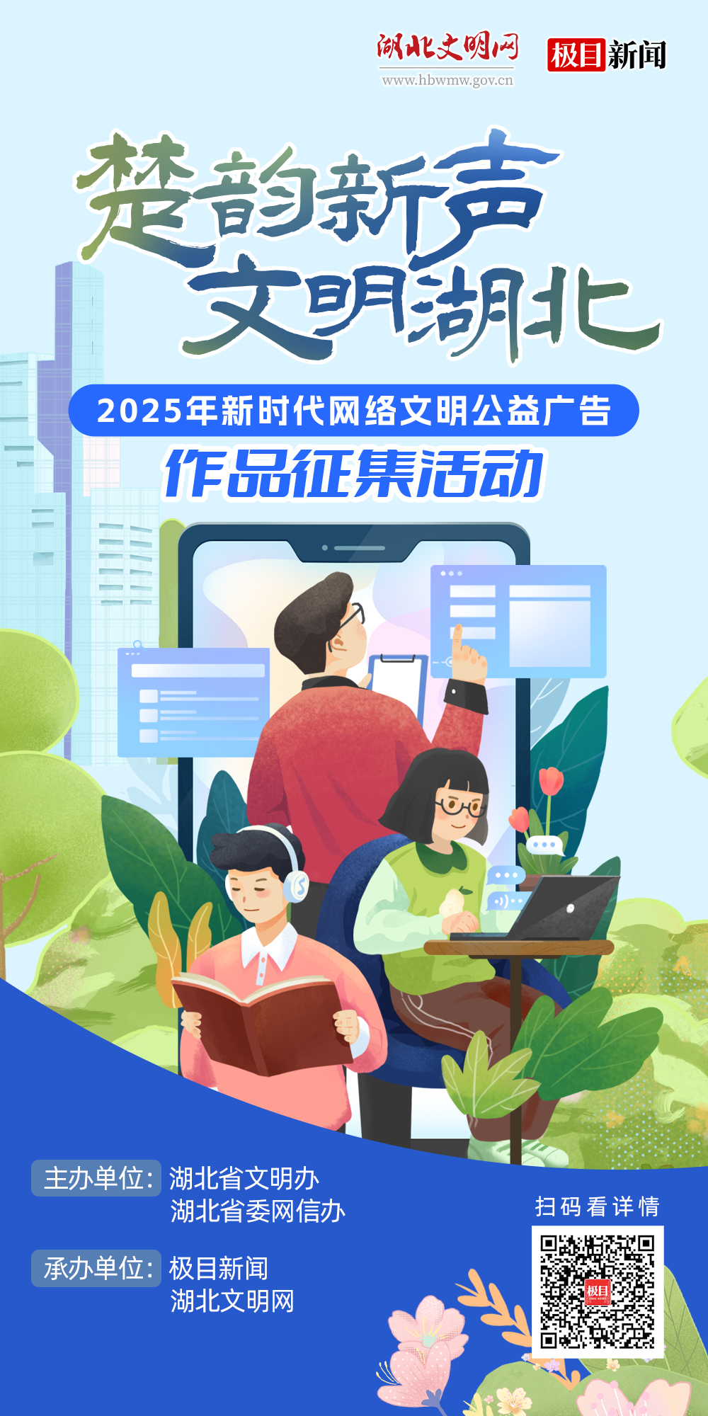 為進一步加強網絡文明建設,發揮好公益廣告弘揚主流價值、傳播文明理念、傳承優秀文化、引領時代新風的積極作用,展現湖北特色文化與時代風貌,由湖北省文明辦、湖北省委網信辦主辦,極目新聞、湖北文明網承辦的2025年湖北“新時代網絡文明公益廣告”作品征集活動正式啟動。