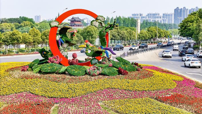 荊州古城內(nèi)外街道干凈整潔、花團(tuán)錦簇。