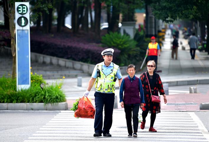 幫扶老人過馬路。 (夏正鋒 攝)
