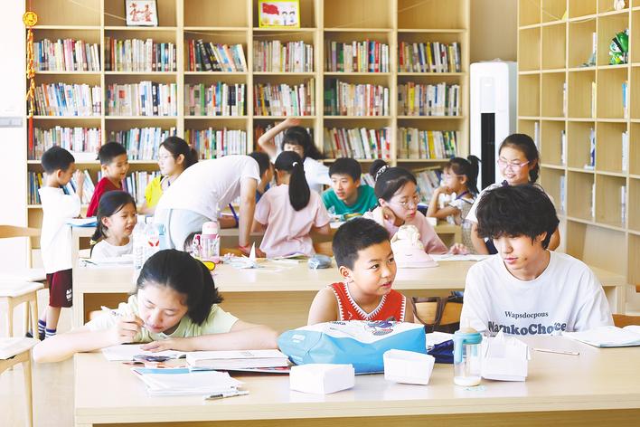 這里正在開辦月畔灣社區(qū)今年暑假第一期子女托管班,社區(qū)內(nèi)25名中小學(xué)生正在志愿者的輔導(dǎo)下完成暑期作業(yè)。