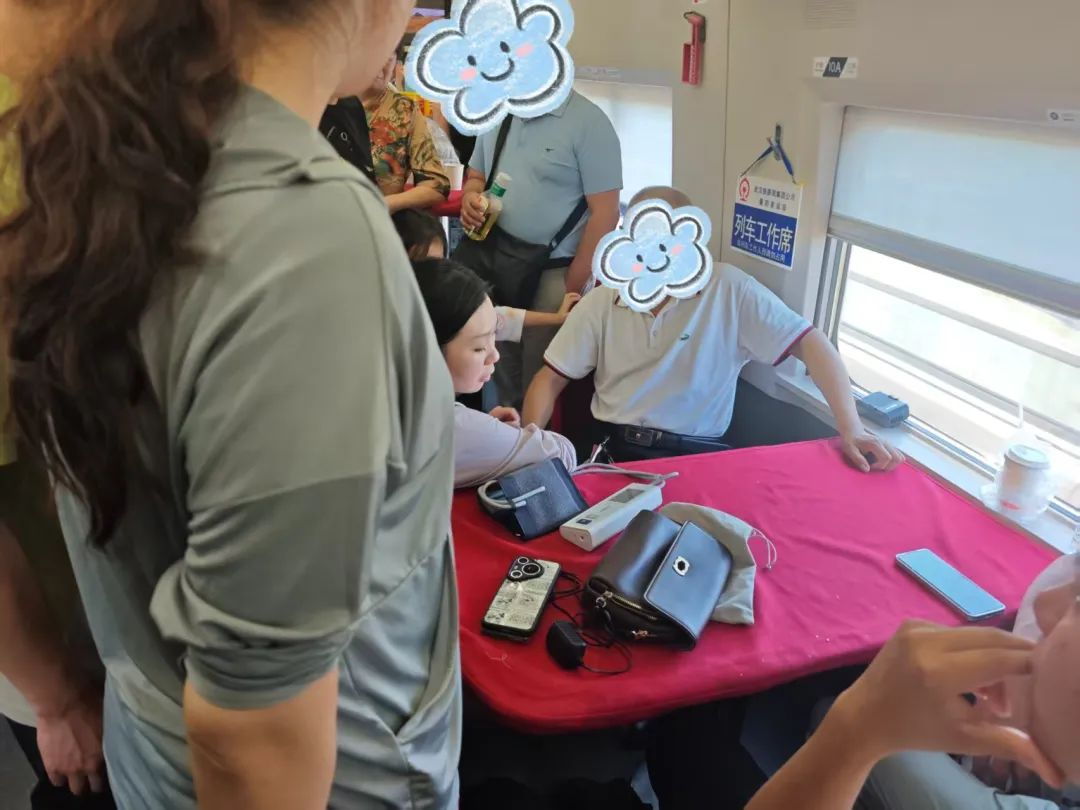 大家撥開圍觀的人群,只見一位老年男性乘客臉色蒼白地靠在座椅上,呼吸略顯急促。“您別急,我是醫生,這些是我的學生?!迸私鸶暌贿叞矒峄颊?,一邊迅速向家屬了解情況。得知老人患有高血壓、冠心病、Ⅱ型糖尿病等多種基礎病時,她先是向患者、家屬及列車乘務員說明團隊的專業資質,在征得三方同意后,立刻安排學生分工合作。他們有的拿出隨身攜帶的急救監測設備,有的輕聲與家屬溝通了解患者既往病史,有的配合列車乘務員疏導周圍旅客。