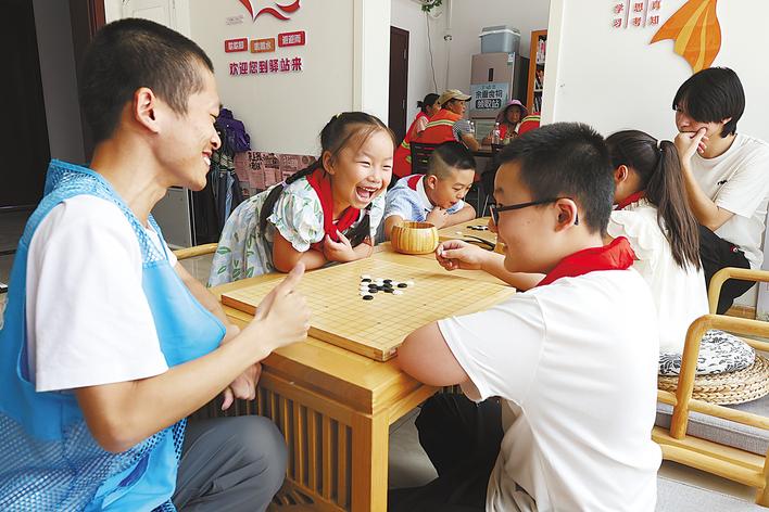 瀾湖工會驛站里,愛心托管班志愿者教孩子們下棋。 (湖北日報全媒記者 王楚 攝)
