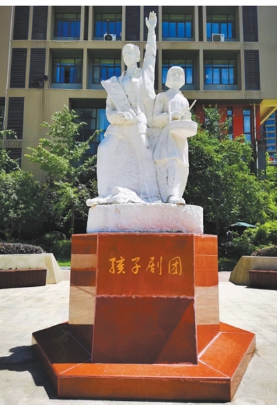 長春街小學(xué)對孩子劇團(tuán)歷史的傳承由來已久。校園里最醒目的雕塑,便是1989年由著名雕塑家謝家生創(chuàng)作的孩子劇團(tuán)漢白玉群雕,藝術(shù)地展現(xiàn)了孩子劇團(tuán)以歌詠、舞蹈、戲劇為武器,開展抗日宣傳活動的歷史畫面。雕塑旁的花壇也以漢白玉浮雕圍繞,濃縮了孩子劇團(tuán)始于上海、興于武漢、歸于延安的抗戰(zhàn)史。校園里還建有孩子劇團(tuán)陳列館,以豐富圖片和實物資料詳細(xì)介紹了孩子劇團(tuán)的歷史。