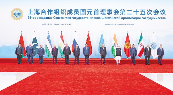 9月1日上午,上海合作組織成員國元首理事會第二十五次會議在天津梅江會展中心舉行。中國國家主席習近平主持會議并發表題為《牢記初心使命 開創美好未來》的重要講話。這是習近平同出席會議的上海合作組織成員國領導人、常設機構負責人集體合影。(新華社發)