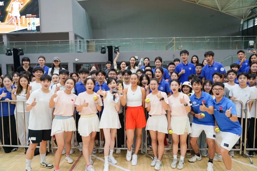 課堂結束后,鄭欽文轉場游泳綜合館三樓,與300余名師生進行體育互動。她為普通生網球隊現場教學,并開展趣味顛球比賽,全場一片歡聲笑語。