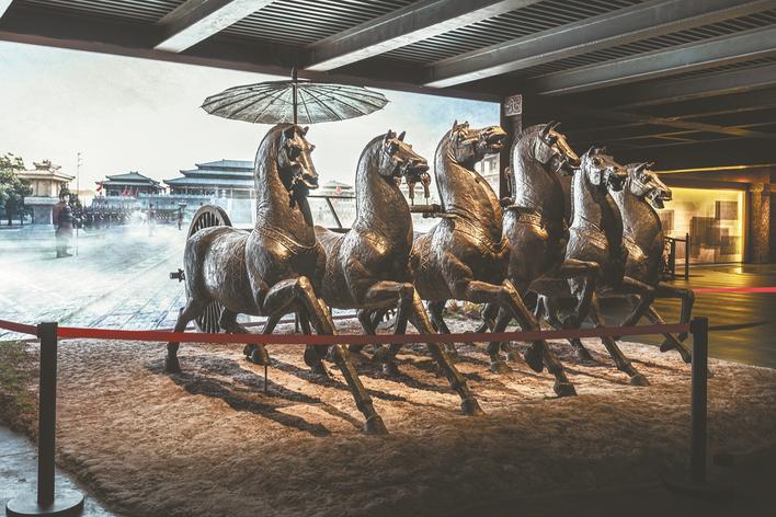 走進熊家冢車馬陣展廳,抬眼望去,四十座車馬坑所組成的車馬陣蔚為壯觀,楚國“千乘之國”的國之威勢。生動的雕塑再現了楚王車馬的威儀,光影沉浸空間讓觀眾走近那段金戈鐵馬的歷史。