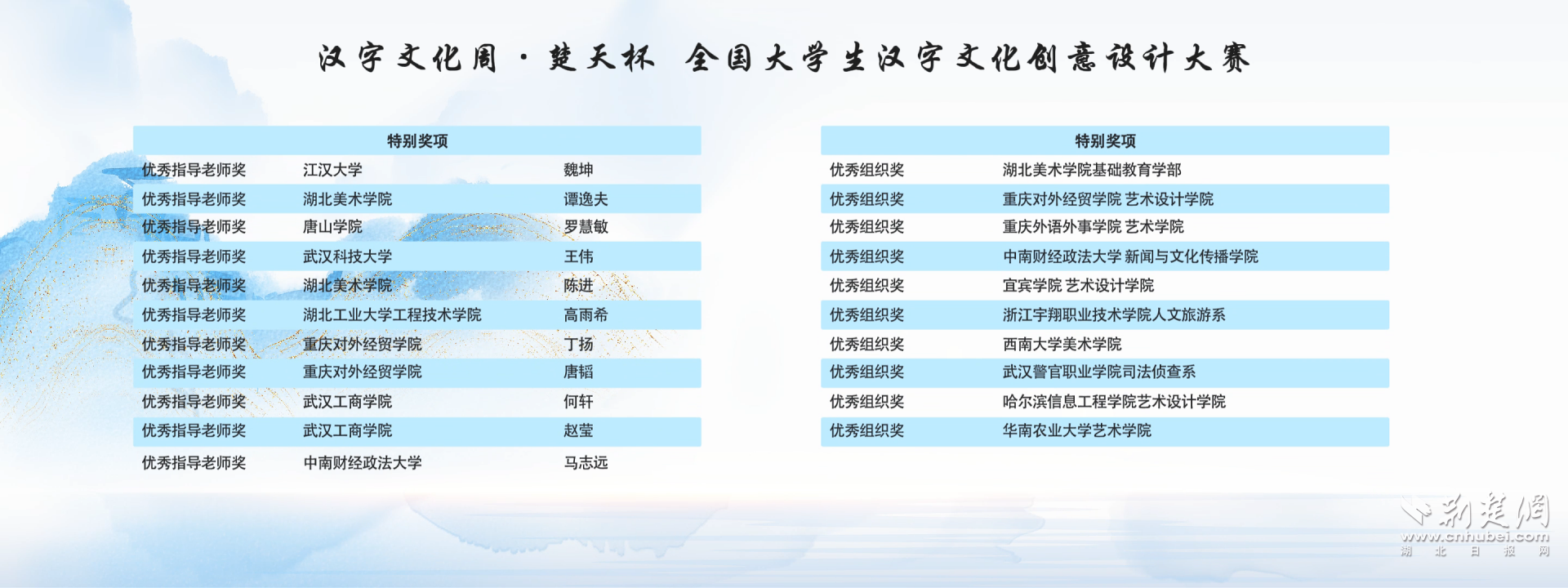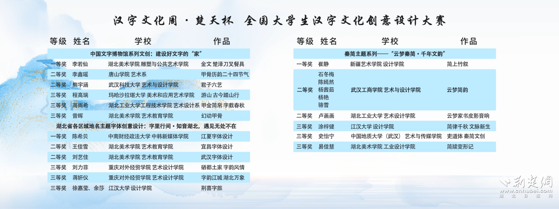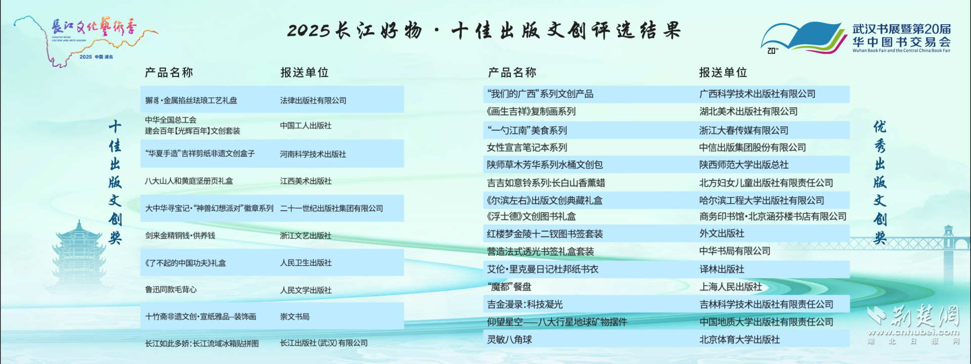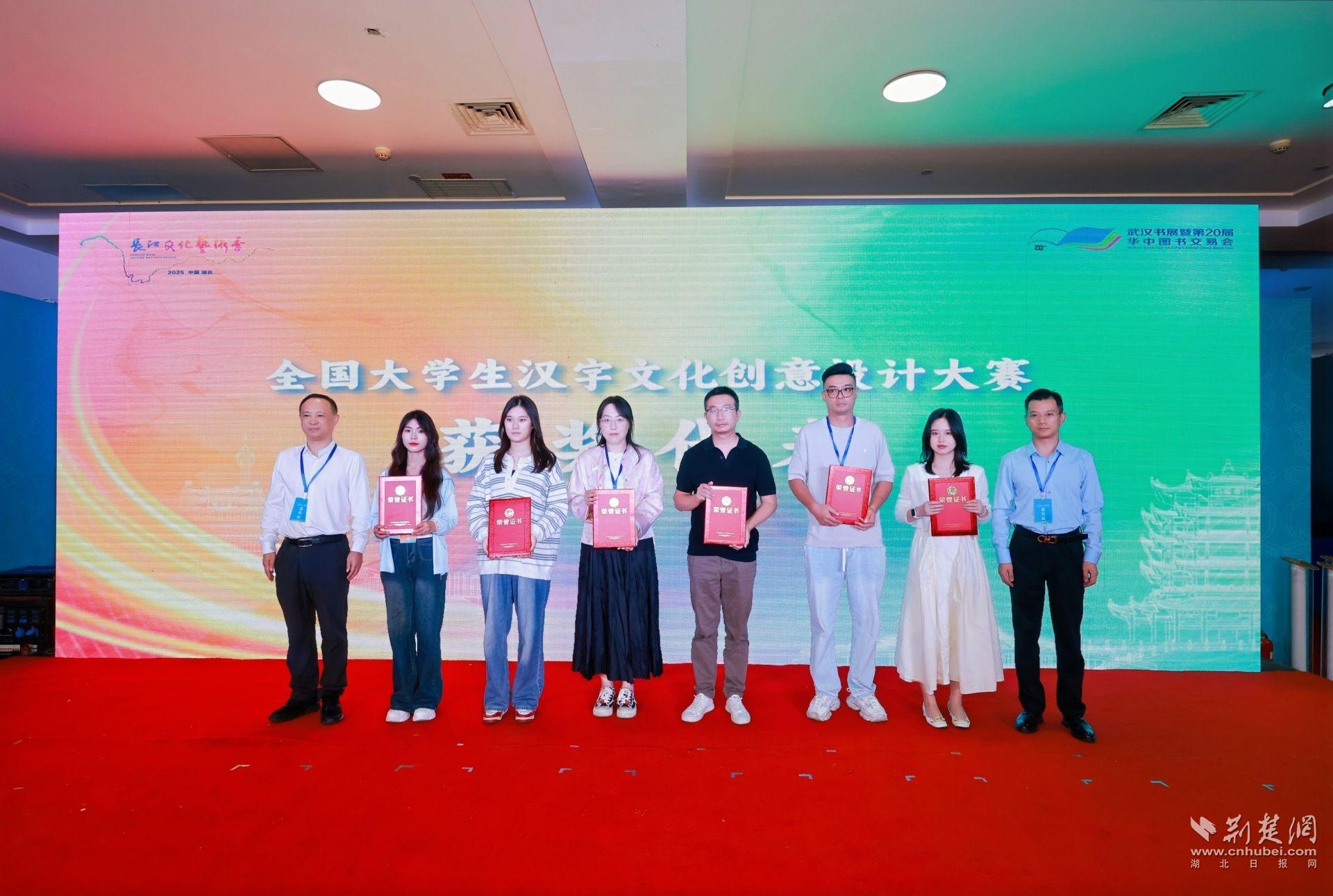 活動現(xiàn)場,首屆“漢字文化周·楚天杯”全國大學(xué)生文化創(chuàng)意設(shè)計大賽和“長江好物系列評選”的獲獎作品發(fā)布與頒獎環(huán)節(jié)備受矚目。湖北省新華書店(集團(tuán))有限公司黨委委員、副總經(jīng)理柏濤、漢字文化周活動組委會主任楊文博為大學(xué)生大賽獲獎?wù)哳C獎,年輕創(chuàng)作者們以創(chuàng)新思維融合漢字文化與現(xiàn)代設(shè)計,展現(xiàn)無限創(chuàng)意潛力;中國出版?zhèn)髅缴虉笊绺笨偨?jīng)理倪成、湖北省曲藝家協(xié)會主席陸鳴為“長江好物”獲獎單位和個人頒獎。獲獎作品涵蓋多個領(lǐng)域,體現(xiàn)長江流域文化內(nèi)涵與藝術(shù)魅力,為產(chǎn)業(yè)發(fā)展樹立標(biāo)桿。