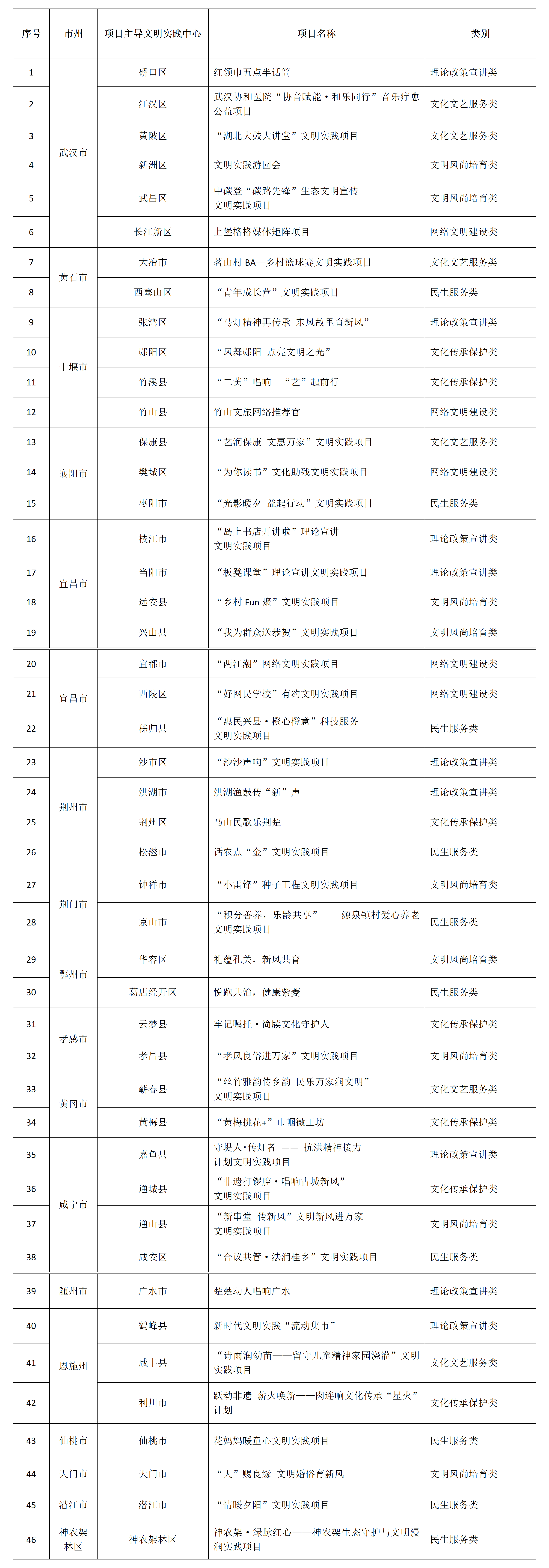 為進一步發揮新時代文明實踐項目對建強用好新時代文明實踐中心的支撐作用,更好凝聚加快建成中部地區崛起重要戰略支點強大精神力量,持續打造“文明實踐 情滿荊楚”品牌,各縣(市、區)新時代文明實踐中心聚焦文明實踐重點工作內容和群眾所思所想所盼,著力夯實項目基礎,加強策劃、設計和組織實施,培育了一批融入高質量發展、助力基層治理,扎根基層、服務群眾的文明實踐項目。經各市州文明辦申報、省文明辦審核,127個文明實踐項目納入省級項目庫,46個重點項目進入全省線上交流展示環節。現通過湖北文明網,對進入交流展示環節項目名單予以公示,接受社會各界監督。如果對入選項目資質有異議,可在公示期內通過郵件、電話、傳真等方式,向省文明辦反映。