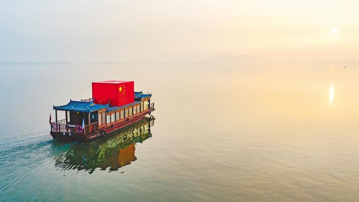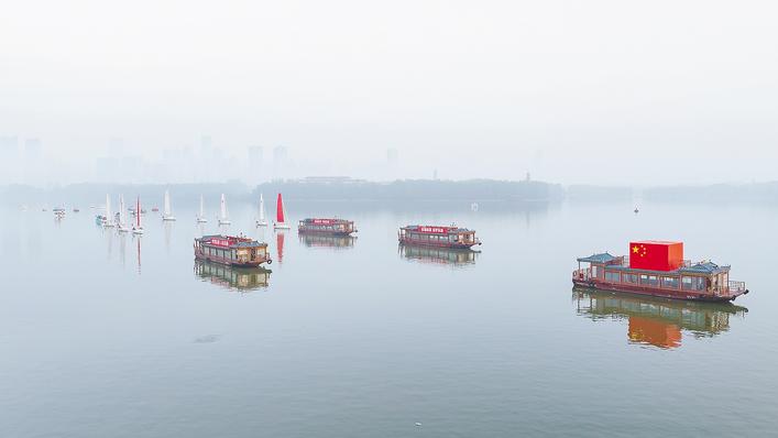 9月28日清晨,在武漢東湖凌波門,以一艘載著巨幅國旗的游船為首,由十余艘帆船、游船等組成的船隊(duì)駛向曙光。(湖北日報(bào)全媒記者 何宇欣 通訊員 高夢雅 攝)