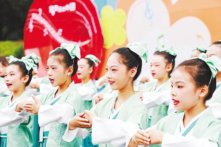 9月28日,“童聲嘹亮、唱響荊楚”2025年湖北省“童聲里的中國”少年兒童歌詠活動集中展演在宜昌舉行。來自全省19所小學的900多名少年兒童用甜美的歌聲、優美的舞姿,展現新時代少年兒童的蓬勃朝氣,表達了對祖國的熱愛。圖為麻城市第二實驗小學學生在表演中。(視界網 黃翔 攝)
