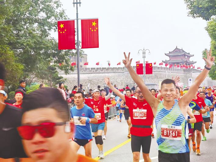選手們沿著美麗的襄陽(yáng)古城墻快樂(lè)奔跑。 (湖北日?qǐng)?bào)全媒記者 劉孝軍 攝)