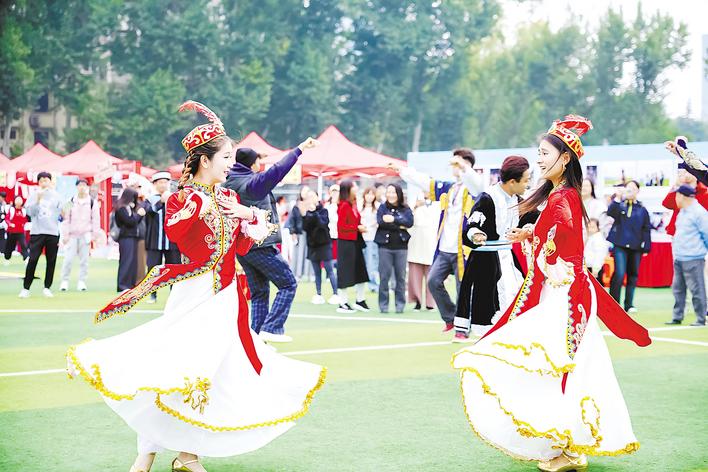 10月25日,華中科技大學“同心筑夢新征程,同行共繪華夏情”第十二屆“石榴紅”文化節火熱開展,身著民族服飾的學生們載歌載舞。(湖北日報全媒記者 何宇欣 通訊員 穆尼熱 實習生 何抒澄 攝)