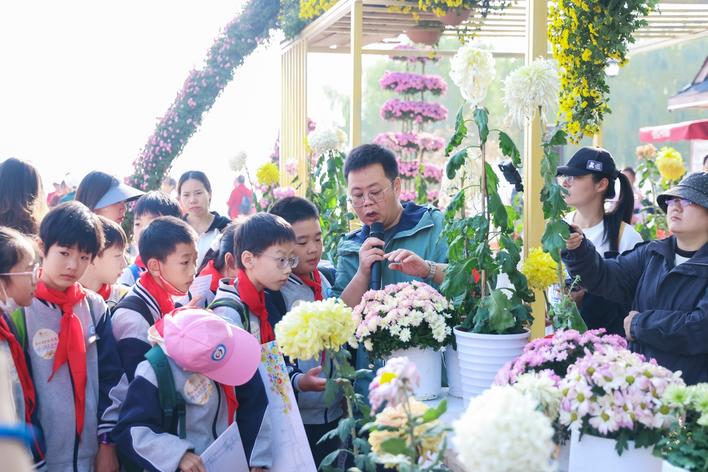 “揭榜掛帥”武漢特色菊花優質品種篩選及景觀應用研究項目團隊為青少年及市民普及菊花栽培、菊藝鑒賞。(受訪單位供圖)