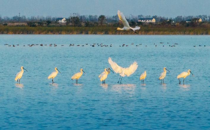 武漢沉湖濕地自然保護區,國家二級重點保護動物白琵鷺在水面棲息。(湖北日報全媒記者 柯皓 攝)