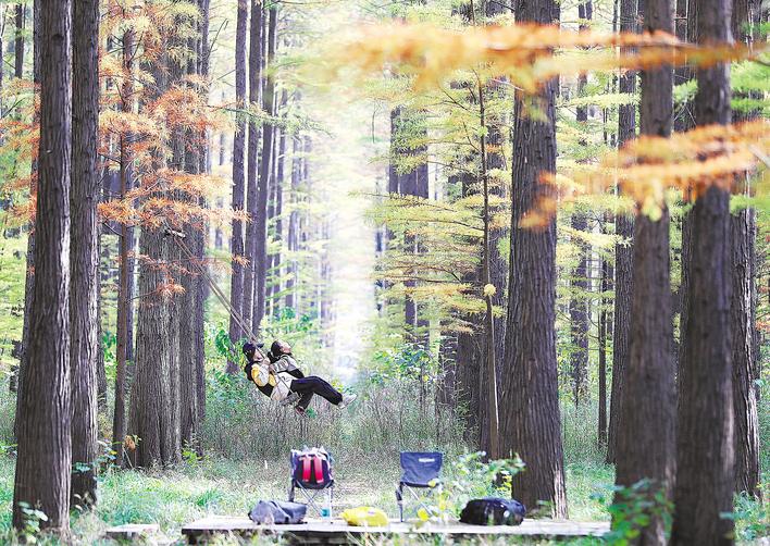 11月22日,游客在京山市太子山國家森林公園游玩。初冬時節,暖陽映照下,百畝林海層林盡染,宛若一幅巨型油畫。近年來,京山市精心構建四季旅游體系,通過持續推進生態價值轉化,繪就一幅人與自然和諧共生的生態畫卷。 (視界網 趙平 攝)